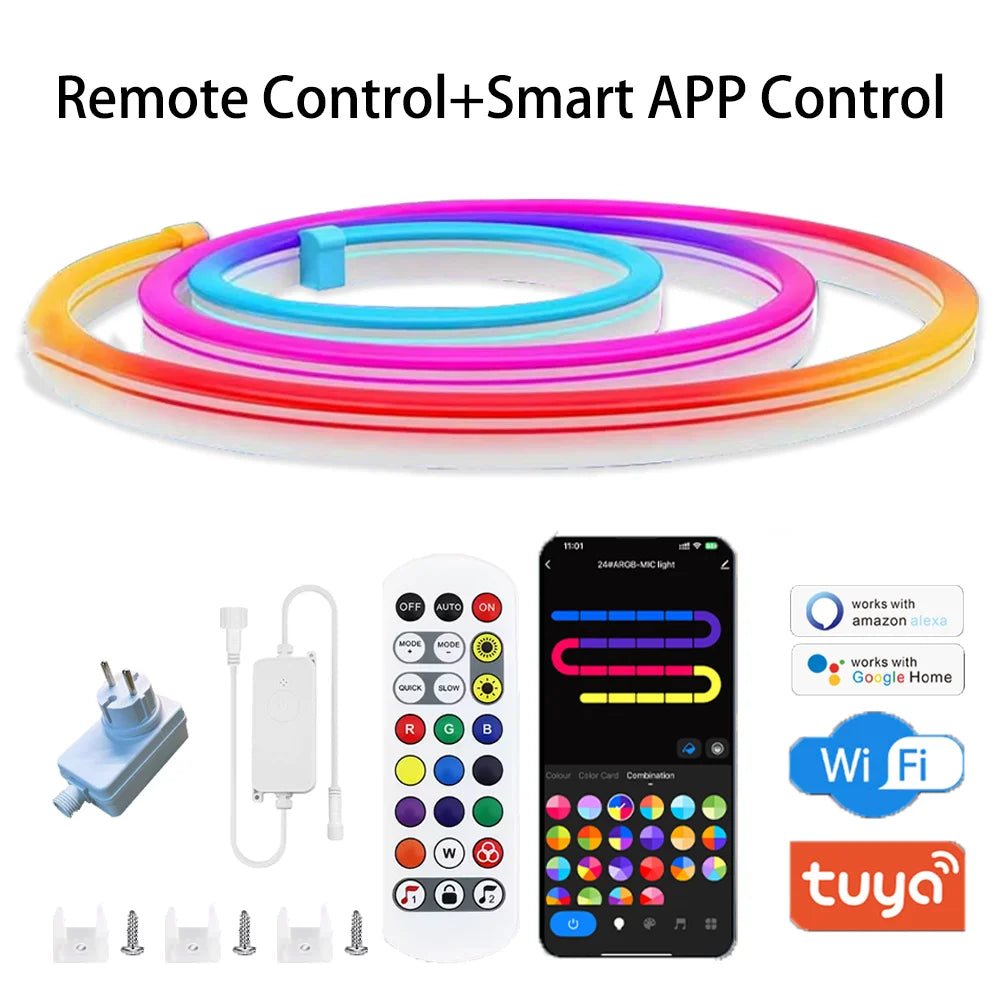 【3 ways to control】The strip light can be controlled via WiFi connection. It is equipped with a 24-key infrared remote control with music modes. The colored lights can be controlled wirelessly even if you are not at home, without distance limitation. Controlled by voice LED lights, and used with Alexa and Google Assistant through simple voice control. Just use "turn on/off the light", "change the color to blue","dim/brighten the light" to control the dialogue, and the 24-key remote control.