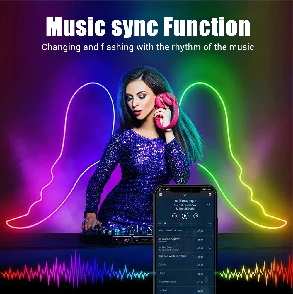 【Music Sync Mode】The Tuya WiFi controller has a music rhythm sync mode, a built-in sensitivity adjustable microphone, and the color of the strip light will change with the rhythm of the sound and music. Create a romantic, gorgeous, and interesting magical atmosphere for your party. Make your lights dim or turn off automatically during the movie to set the right atmosphere.